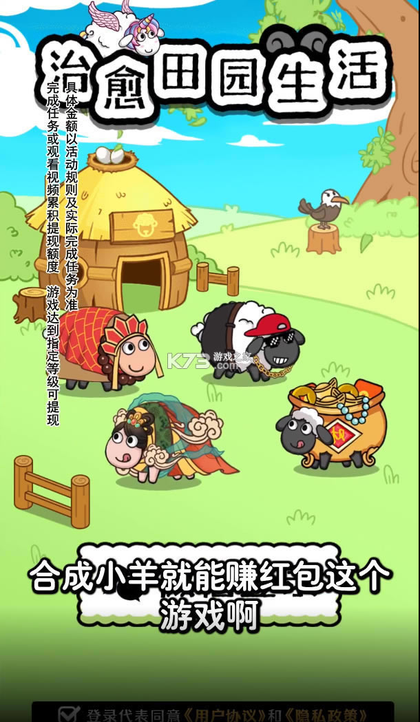 治愈田园生活游戏是一款休闲合成类赚钱小游戏。玩家在游戏中只需要手指点击屏幕,将同等级小羊合成更多高品质小羊即可获得红包奖励,解锁小羊图鉴还有惊喜福利等你领取,满0.3元即可提现。