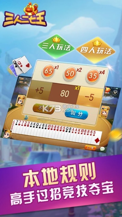 一部以南昌地区较为流行的扑克牌手游。三人二七王手机版玩法经典还原南昌本地的二七王规则,将游戏的人数设置在三个人,更加刺激的游戏性,最具南昌本地气息的扑克牌游戏,还能赢取话费哦!喜欢的话就下载三人二七王手机版吧!