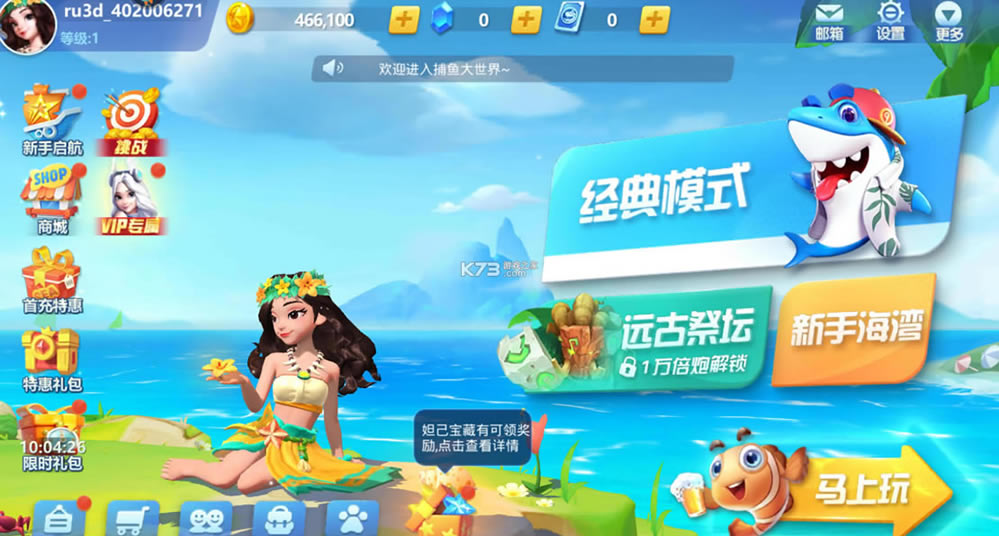《捕鱼大世界》是波克城市出版,新宠物呱呱上线了,首充领特惠炮升级,解锁新房间新的宝藏,抽渔券,新手专属商店福利折扣超级多,消费200点券则可升级vip,新手福利多,登录还可以领福利。