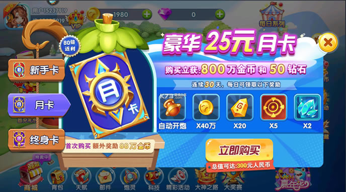 月卡,豪华25元月卡,购买获得800万金币和50钻石连续7天还有豪礼首次购买额外送88万金币。