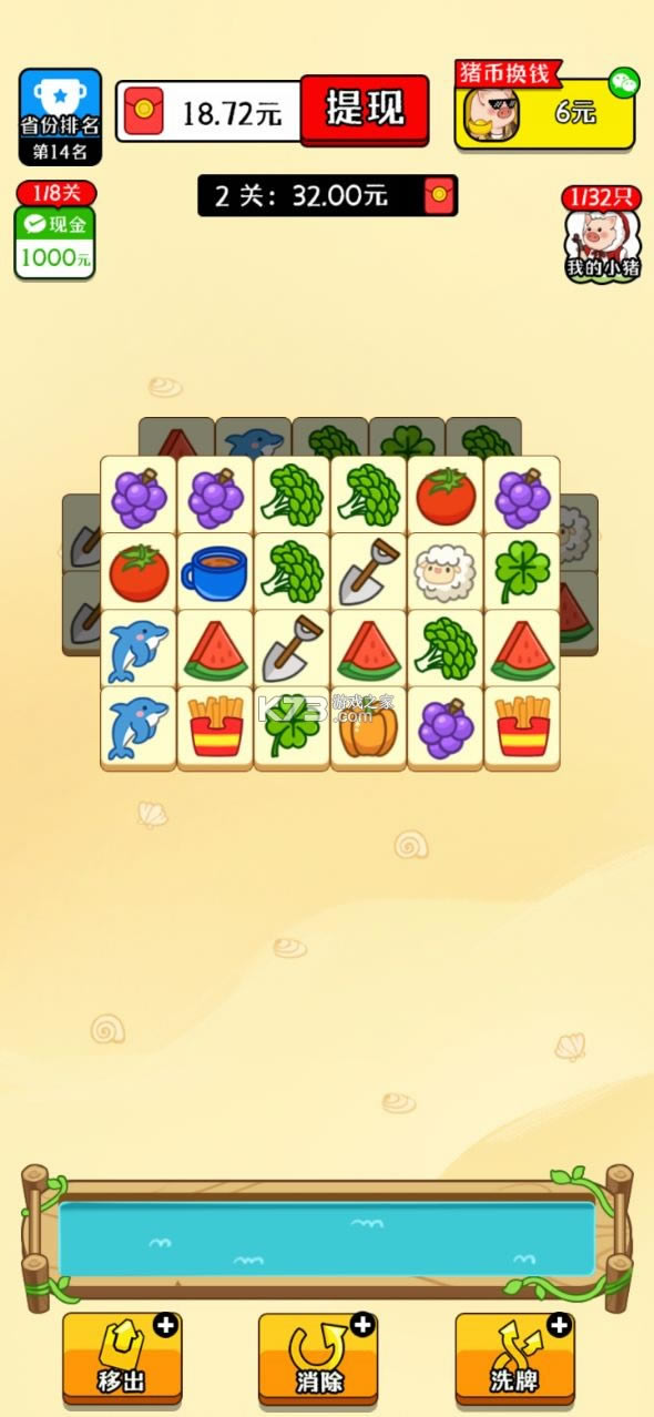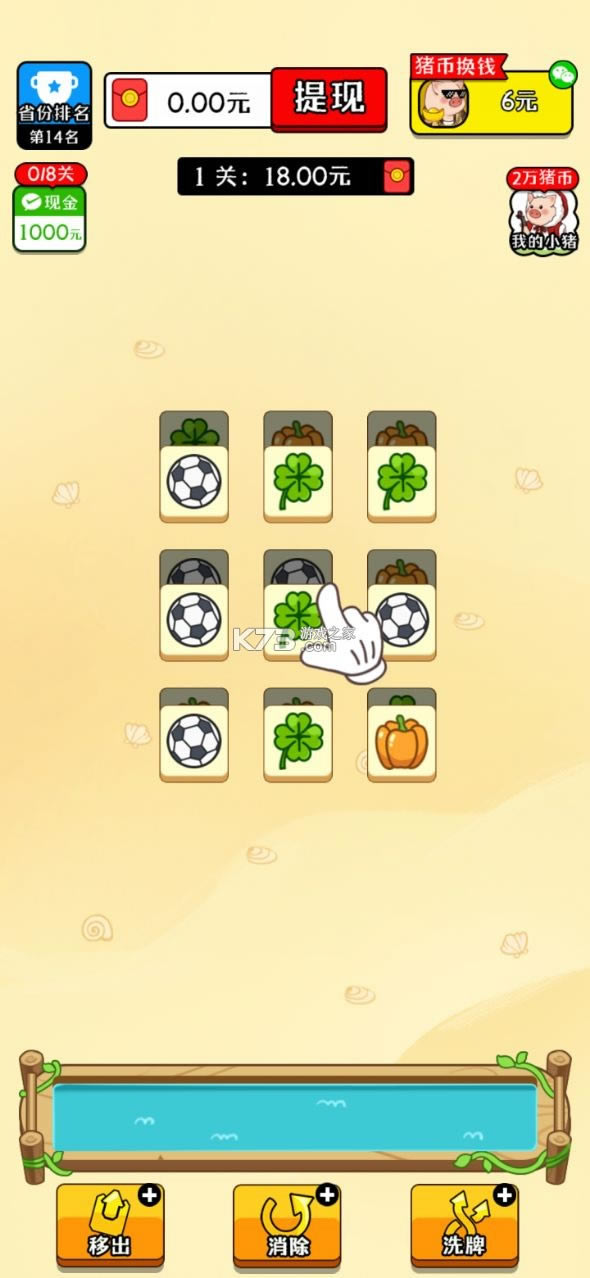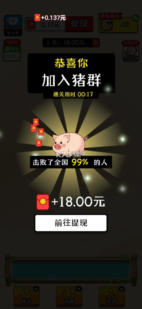 《动物世界》红包版游戏采用了“羊了个羊”的消除模式,加入猪群领取红包的玩法,小编测试真实可领红包了。完成每个消除卡槽关卡,就可以加入猪群解锁小猪,解锁全部品种的小猪才可以兑换币,也是可以兑换红包的。