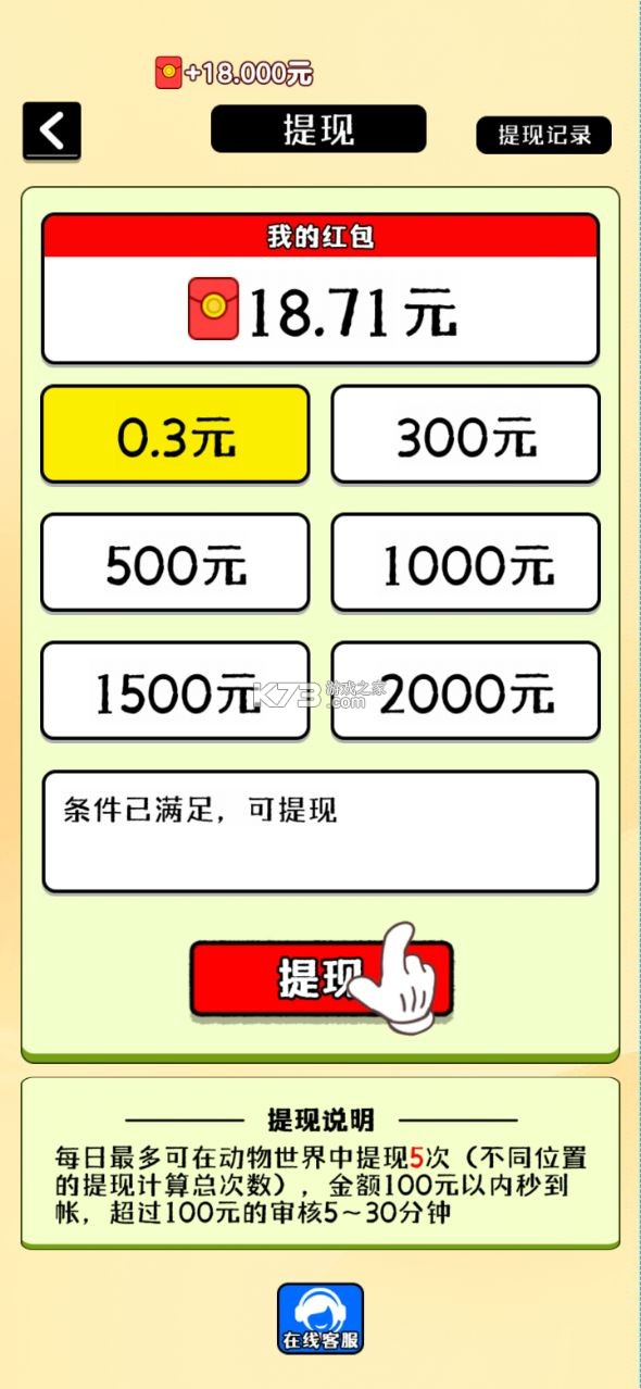 动物世界安卓版最新版,其中这是真的能提现的,只要玩游戏就能免费的领红包,还增加了羊了个羊最新的三消玩法,其中的难度没有那么高,其中的关卡却非常非常多哦,想获得更多的红包吗,赶紧下载吧!
