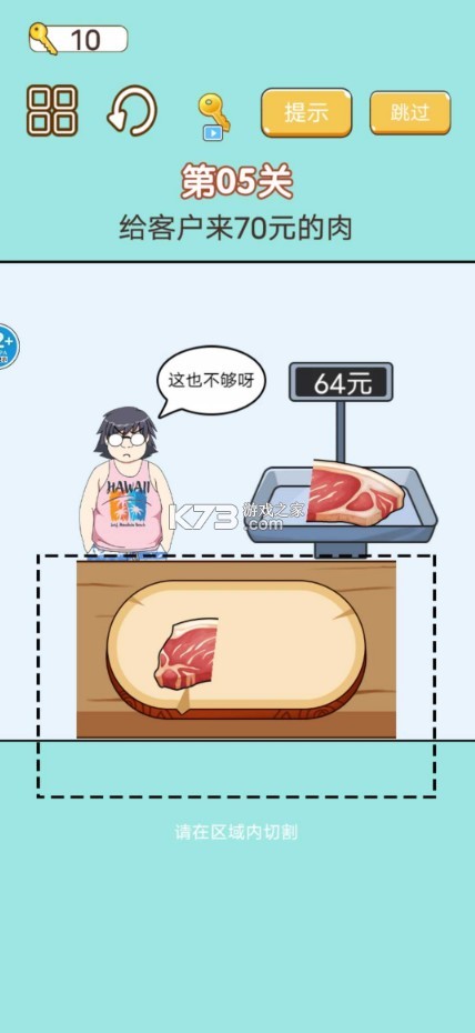 本站为大家带来称量达人最新版本下载安装,称量达人最新版本是一款非常有趣的休闲游戏。这个游戏要求你根据客户的需要画出最合适的切割线,然后开始切割,它完美地实现了客户想要的体验,让玩家可以自由地玩,最新版本更新了大量内容,感兴趣的朋友快来下载吧。