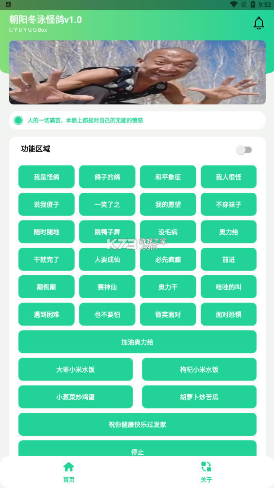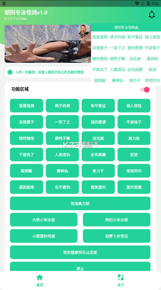 《冬泳怪鸽盒》是一款由用户们自制的趣味恶搞语音包软件,这里为用户们带来了海量冬泳怪鸽的原声语音素材,通过点击关键词的方式进行播放,轻轻松松让你捧腹大笑,还有各种各样的网络热梗词。