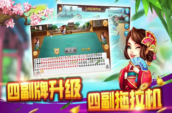 升级是国内非常盛行的一种 4 人扑克牌游戏。采用抢分升级经典棋牌游戏模式,也被称为"80分",因为有拖拉机的牌型,所以通常称为"拖拉机"。还有的地方也有叫 "摔小二" 、"炒地皮"、"五十K”等。升级游戏中,不仅有经典的拖拉机升级80分的玩法,还加入了炒地皮、连打等新玩法。