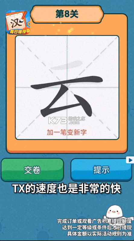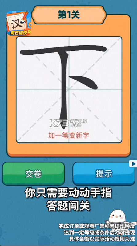 添笔画赚红包的手游你需要在规定的时间内完成不同的挑战任务,在游戏中丰富的汉字挑战内容等你不同完成,各种汉字主题的关卡设计,每个关卡的的玩法不同,让自己能够获得更多的奖励享受更多的玩法