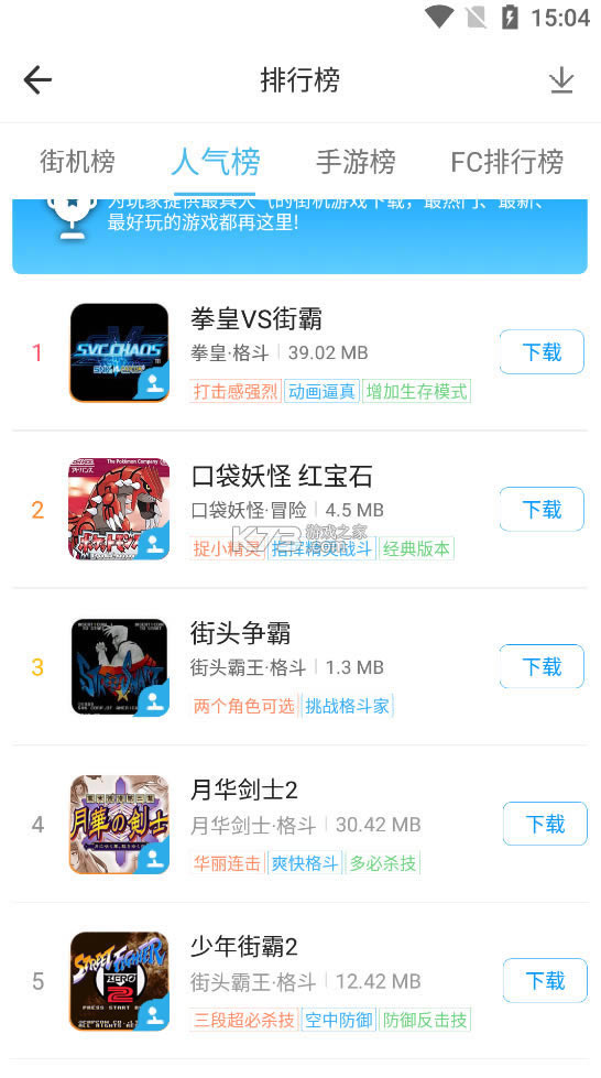 想在手机上找回当初游戏厅摇杆操作街机游戏的感觉吗,那就快来试试街机123最新版吧!这是一款非常不错的经典街机游戏盒子,里面有着上百款精选经典街机游戏,无论是拳皇、街霸、超级玛丽、魂斗罗、恐龙快打,还是名人战、三国战记、战国ACE、鹦鹉历险记,在这里你统统都能找到。该软件内置最新版的MAME模拟器,完美解决了虚拟按键的多点触控问题,真实还原街机摇杆的操作快感,并且游戏画质和人物角色模型也得到了进一步的优化,让你在找回童年记忆的同时感受到创作技术的进步。除此之外,街机123最新版还针对广大年轻用户群体的游戏需求,运用了独特的算法,主要就是根据我们用户的个人信息、兴趣爱好以及地理位置等一系列的因素,为用户打造了全新的推荐模式,这样就可以为您精准推荐适合的游戏了,欢迎有感兴趣的朋友前来下载体验。