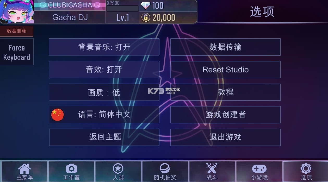 9、点开选项,还支持对背景音乐、音效、画质等进行修改。