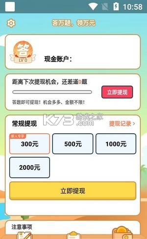 新人注册领现金,提现秒到账 首次注册答题赚钱领取新人红包奖励,当天提现无门槛秒到账,每一笔收益实时更新