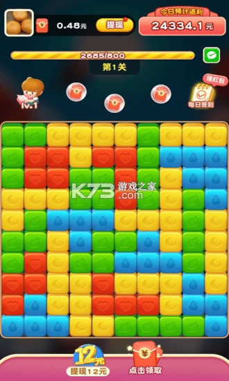 一款经典的消消除类游戏,大家对于这类游戏软件接受率还是比较高的,因为没有复杂的玩法,同时还添加了赚红包的模式。下载全民爱消消ol红包版,不用看广告按提示领奖励。提现0.3元,秒到微信零钱!付款商户“游戏福利”。