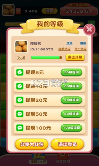 这个游戏除了闯关赚钱之外还有很多玩法,单价差不多3分钱一个红包吧,需要看广告,抽奖啥的都可以领红包,然后还有分红玩法。