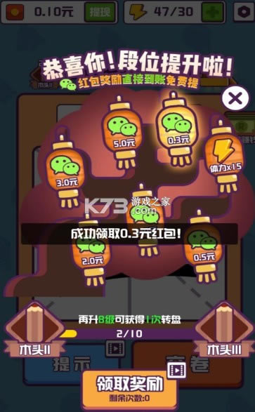 汉字高手红包版里面有着更多数量的关卡让玩家挑战,对于通关成功后的奖励,系统会及时发到玩家个人背包之中,且随着更多新奇篇章的解锁,大家所能够得到的快乐将愈发咩咩难忘,快来游戏中畅玩一番吧!