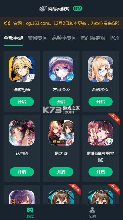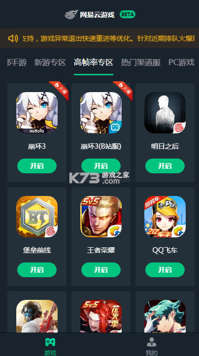 网易云游戏的平台上已经提供了多款网易以及其他友商的手机游戏,其中包括像《阴阳师》这种网易自家的游戏,也包括比较热门的《明日方舟》《双生视界》,还有《崩坏3》这样打击感强、需要及时操作的游戏。目前该游戏平台目前拥有“全部游戏”、“新游专区”、“高帧率专区”、“热门渠道服”、“PC游戏”几个专区,PC游戏专区还没有加入产品,其余分区提供的游戏全部为手机游戏。