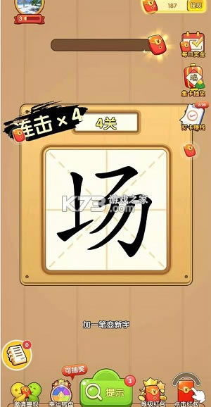 一款专门围绕汉字开发的益智闯关游戏。添一笔让汉字成立就是这款游戏的核心玩法,随着关卡的推进游戏的难度会越来越高,不过奖励也会越来越丰厚哦。不仅游戏的内容益智有趣,奖励也是非常令人欣喜的,每天上线签到还能获得额外的奖励哦。