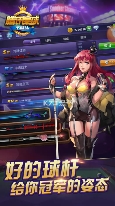 尖端巧粉,杆杆随心,游戏中配置多种属性、不同品质外形的球杆和球桌,超炫球技,彰显至尊身份。