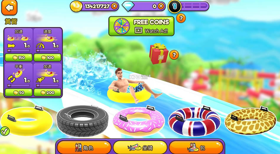 您可选择各种滑行工具,例如浴缸、鲨鱼或水上摩托艇,每种工具都拥有独一无二的特性,带给您更多乐趣。收集钻石可解锁更酷的升级,使用增强道具可以提升能力!