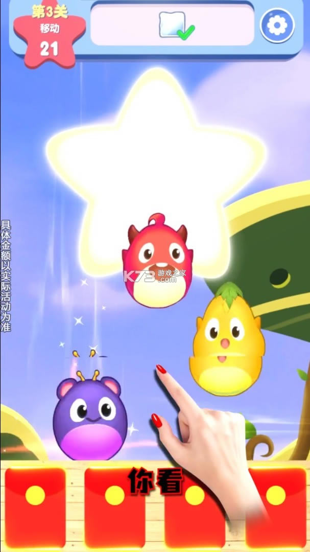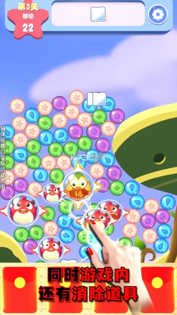 1、动动手指,就可以消除糖果球,完成每关的指定的消除目标或者指定分数,即可过关