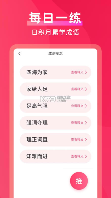 2、完成各种成语接龙的玩法不但可以让用户在不知不觉间吸收各种成语知识,还可以通过完成任务获取平台中的金币奖励,奖励可以在互动模式中兑换收益;