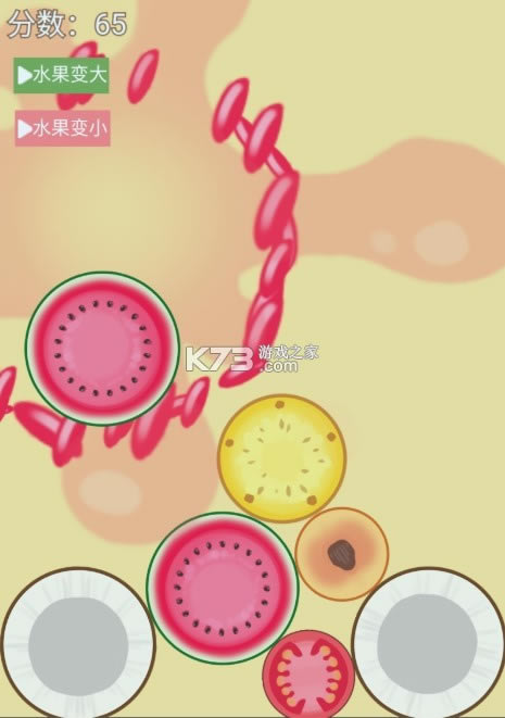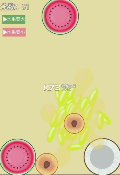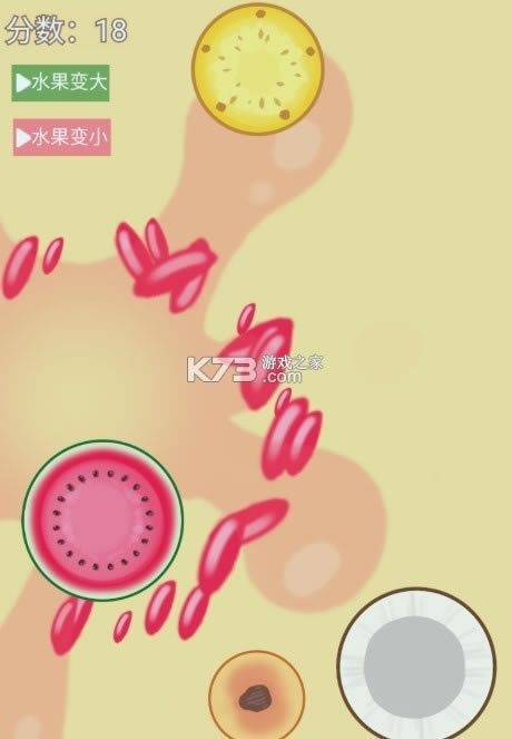 3、可以通过手指滑动水果,将两个相同的水果合成一个更大的水果。合成的水果越多,获得的分数越多;