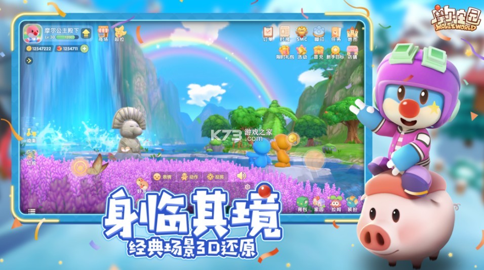 《摩尔庄园》全面升级为超大的3D世界,将摩尔城堡、摩尔拉雅雪山、淘淘乐街、爱心广场等经典场景以更立体、真实的形象呈现,摩尔们可以在不同的地形中做出各种行为,行走、游泳、雪山缆车、蹦床等等,畅享不一样的地形互动乐趣。