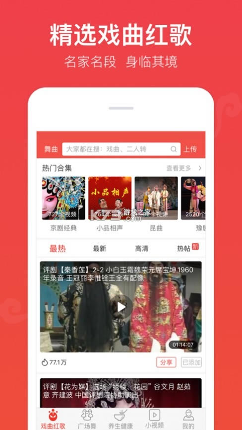 《戏曲多多旧版本》是融合了不同风格的视频内容,首先是如同app名字一样的戏曲内容,该内容占据了软件的主要视频比例,为所有戏曲爱好者提供专业的平台进行观看研究,然后是偏向生活类的视频内容居家出行、美食烹饪、健体广场舞等多方面活动。