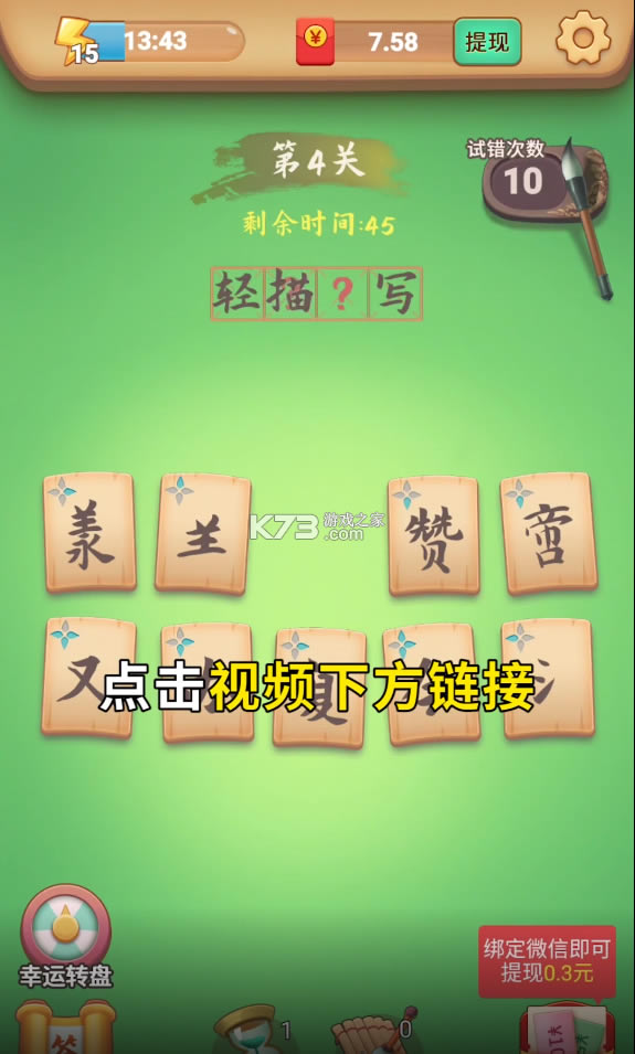 《拼字得宝红包版》全新的拼字赚红包游戏,最近在各个平台都非常的火爆,玩家只需要在空格填入字即可,通过所有的关卡就可以获得丰厚的红包奖励,猜的越多赚的也就越多。