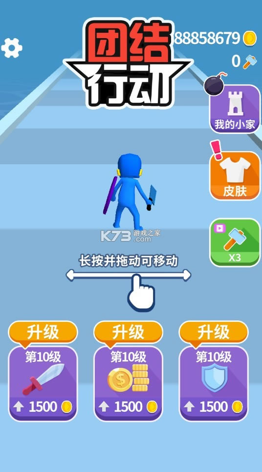 《团结行动无广告无限金币版》是三分钟工作室发行的一款休闲娱乐手游,游戏中玩家需要进行的是控制角色移动,然后在限定的行动范围内,撞击小白人,收纳团队,最后在最终的城堡争夺战中因赢取比赛的胜利。整体来说,游戏操作简单易懂,画风也彰显出了很好的休闲风味,但就是这样的一款迷你小游戏,也有可圈可点的闯关难度在里面,精心设计之下的不同关卡会有各式各样的障碍和机关阻挡你的前进,为此你需要有一个快速、敏捷的反应操作,还需要眼力为分配你的手速进行各种闯关冒险。但就从团结行动的游戏玩法上来说,难免会乏味枯燥,因此,这款游戏还在其他创意玩法中增加了亮点,有可变换的皮肤选择,可强化升级的阵容攻击和防御,以及自我城堡的自由建设等,这些新颖的玩法亮点,不仅增加了游戏的趣味性,同时也丰富了游戏玩法,对此若有感兴趣的玩家,欢迎免费下载体验!