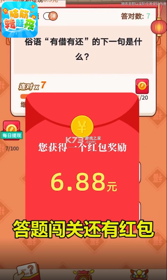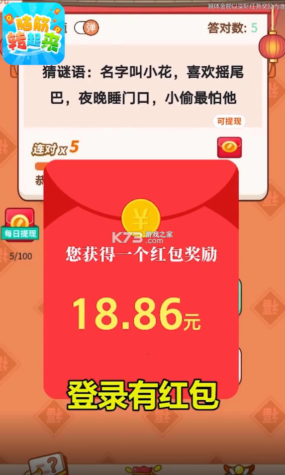 《脑筋转起来红包版》这是一款最近在抖音非常火爆的答题赚钱益智游戏,登录有红包,签到有红包,答题闯关还有红包,不用绑卡不用实名答题让你轻松赚钱,欢迎前来下载答题赚钱。
