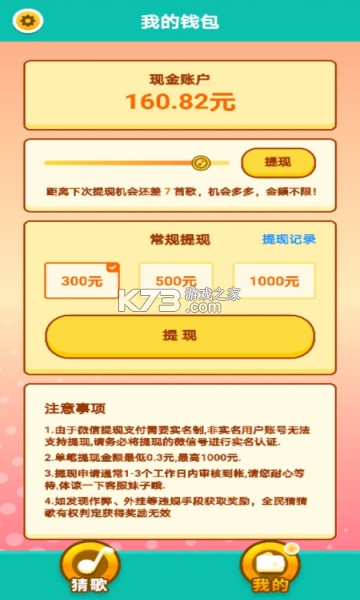 全民猜猜歌游戏是一款十分相当经典和有趣的猜歌领红包的游戏,平台上有丰富海量的曲库资源,拥有多种竞技玩法,用户闯关成功即可获得红包奖励,等级越高奖励越越高。