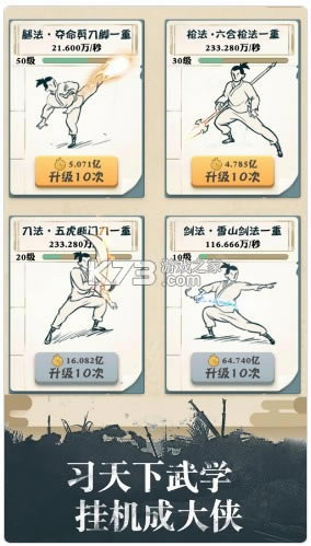 更多的武侠创新玩法,自由的武侠挑战,直接来这里进入江湖体验,挂机自动成长,超多的武功学习,放置的游戏玩法模式。