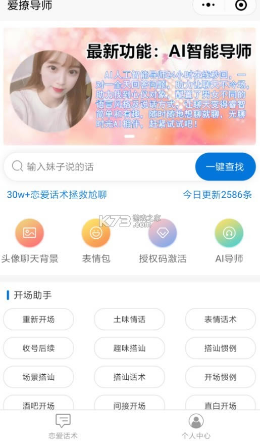 《爱撩导师》是一款能够提供授权码激活的恋爱软件,一款恋爱话术专业的appp平台,为大家来提供超多的话术了,拯救尴尬式聊天,拯救话题终结者。能够带你追妹教你找对象的游戏。快来这里点击下载加入本话术软件吧!
