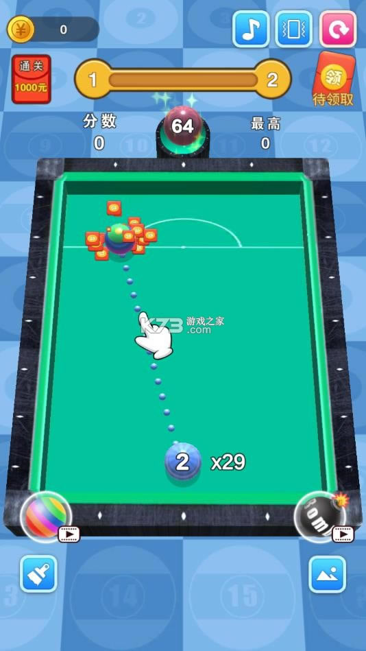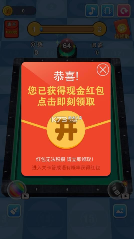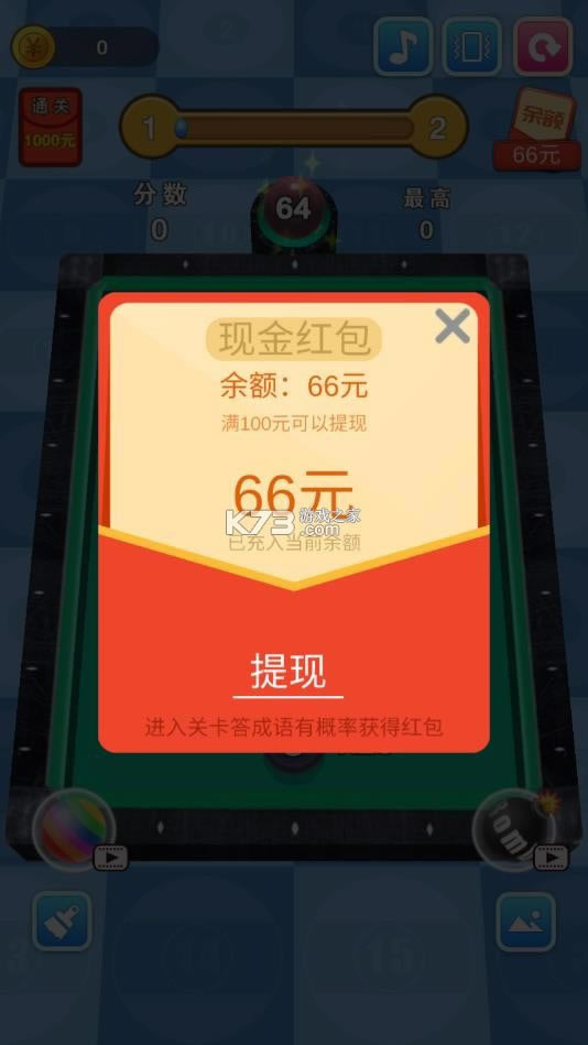 《桌球2048》这是一款将桌球与2048 的玩法进行相集合的一款趣味性的赚钱小游戏,在游戏中进入游戏简单的玩几下就可以领取66元的红包奖励,满100元才可以轻松提现到账,里面还有通过奖励1000元现金红包,超多的福利等着你领取。