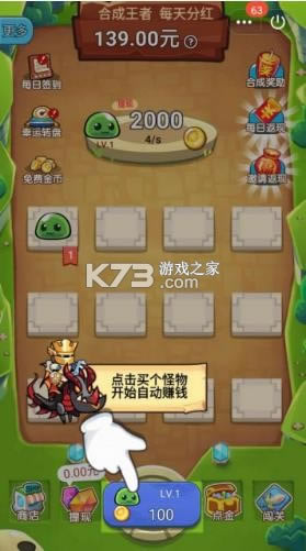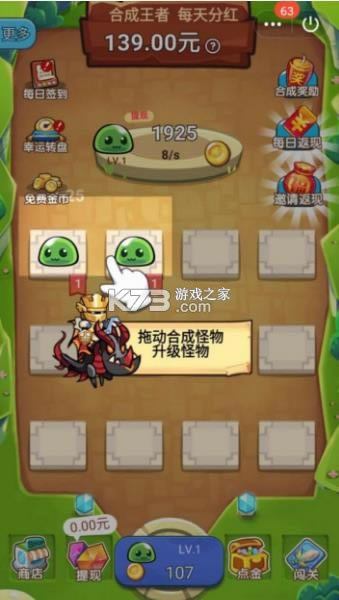 《王者合合合》这是一款主要是以合成为游戏的主要玩法的一款赚钱类型的游戏,在游戏中将相同的怪物进行不断的合成,从而进化成为更高级的怪兽,合成到37级将享受分红奖励,快来玩游戏赚收益吧。