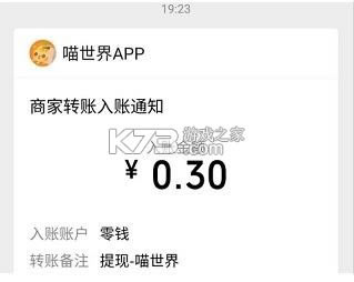 今天新上线的这个喵世界听说是陀螺世界旗下作品,新人登录后可获得一个红包,能直接秒提0.3元,非常爽快。