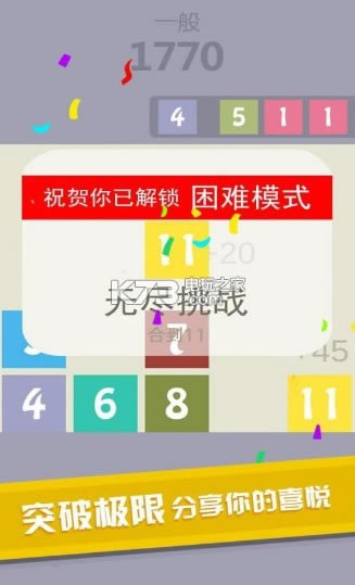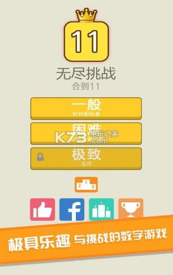 你可以选择一般、困难和极致三种完全不同的模式加入,相同方块合成数字就能够将加一。慢慢的加到11就可以了哟!