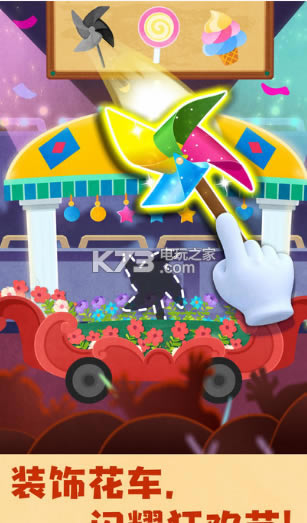 巴西狂欢节开始了,宝宝可以乘坐花车,参加巡游表演,组装花车,用鲜花、彩球装饰;