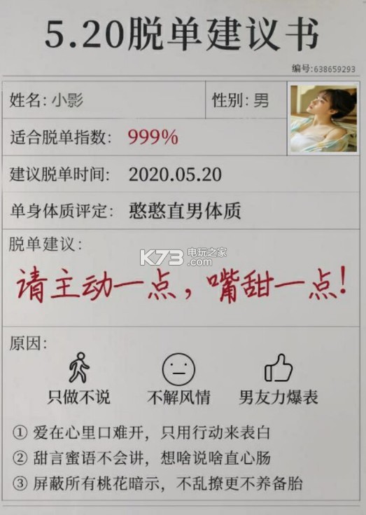《520脱单建议书》是最近朋友圈火热的一款520脱单建议书,520脱单建议书二维码图片可以支持直接进行脱单测试,能够看到你的脱单指数,能够获得你的脱单建议,还有单身的原因也是能够给出的。