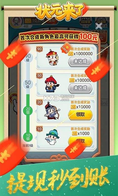 《状元来了》这是一款采用的是合成赚钱的一款趣味性的休闲类型的游戏,登陆游戏就可以轻松的领取红包奖励,每天挂机也可以轻松的享受收益,还可以进行快速的提现秒到账,让其可以轻松的赚收益。