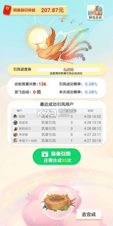 1.通过合成小鸟获得筑巢引凤的机会,每次筑巢引凤都有机会成功引到凤凰。小鸟合成升至最高级别后,可以放飞,每次放飞都能提升引