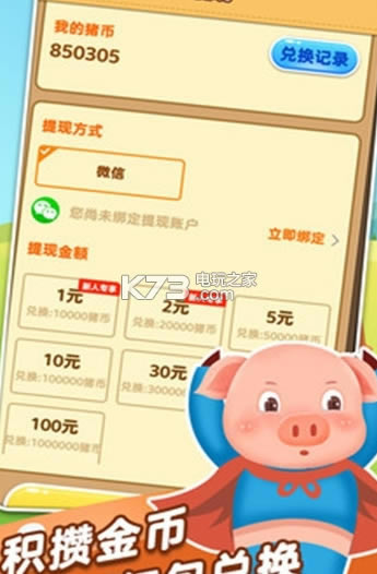 《福气满满猪》这是一款采用的是养猪赚钱的一款趣味性的休闲游戏,用户将在手机上进行养猪进行轻松赚钱,进行注册的话将送小金猪,获得的钻石可以直接兑换成现金奖励,让其轻松可以赚钱。
