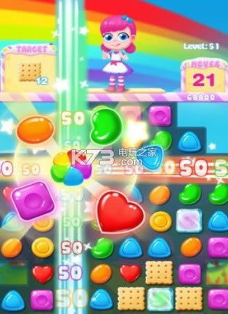 一款非常好玩的消除游戏,多样的关卡,每一关都需要达到指定的分数才可以成功的过关,操作非常简单,特效华丽逼真,只需要你将相同的糖果连成线就可以完成消除啦!规则简单,但是想要登上排行榜还是很有难度的,千万不能小看简单的消除,可是藏着大智慧的哦!