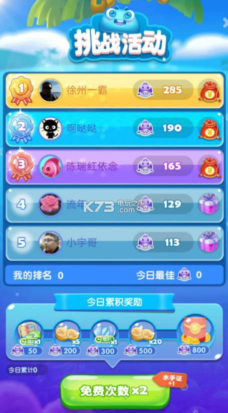 《点点消宝藏》挑战活动春日全新开启,累计击败鲨鱼数量可以获得丰厚奖励,更有单次挑战击败鲨鱼数量大比拼,每天单次参加挑战活动击败的鲨鱼数量越多,得到的奖励也会更加丰厚。第1名更有千元红包大奖。第2名500元,第3名200元。奖励每天发放,今天没抢到不要紧,每一天都是一个新的挑战,尽情击败鲨鱼抢占榜首吧!