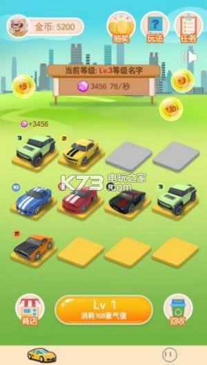 1、合成赛车赚钱:两辆同一等级车辆轻轻拖动即可合成一辆高等级车,升级将解锁更多高级车辆,同时特定等级还可获得升级红包。等级越高,所产生金币越多,车越有价值。能源车,分红车,红包车,弯凤车等目不暇接,休闲合成,暴利收益,先到先得!