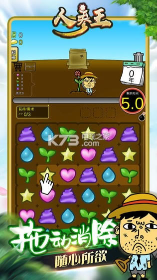 说说这几天玩这个游戏的感受吧:首先游戏画面有点逗,人参种类很多,每个都有梗(这里都是知识点,知识储备量不够会get不到)。游戏的玩法上除了3消的传统规则,还有要在有限的时间内,拖动养分使格子内的布局变化,尽量达到消除更多的养分,没拖动一次后,增加1年的年份,人参的年份越高需要的养分也就越多,当养分达不到人参生长的需求时,就要收割人参了,收割人参可以卖钱(看广告获得双倍),这是钱的主要来源。游戏中还有盖房子、宠物、道具这些可用来增加收入和一些易于消除的系统,这些搞一搞,后面会让获得高年份的人参更容易,同时获得钱的数量更多,但是后面盖房子、升级宠物需要的钱也是海量的。宠物的作用是增加每回合获得的养分以及一些消除特效增加拖动时间等等,多个宠物的效果可以同时生效。