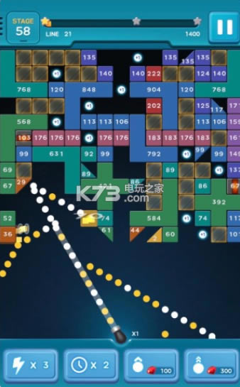 3、每一次射击之后砖块会向下掉落一格,优先攻击最底部的砖块。