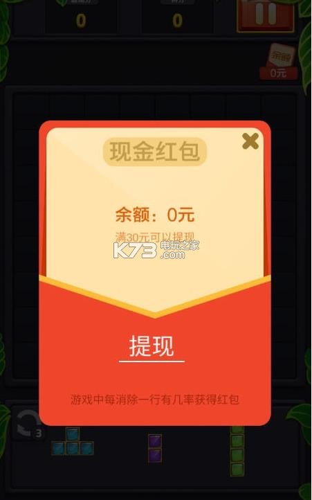 《俄罗斯消方块红包版》这是一款经典的消除赚钱类型的小游戏,比较复古的画面感,需要将颜色相同的方块进行消除,里面非常多的关卡进行设置,闯关成功的话还有红包奖励。