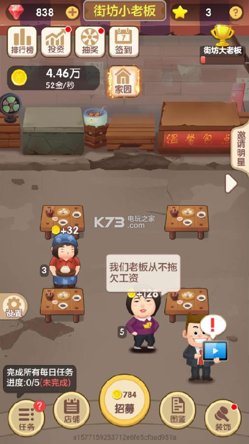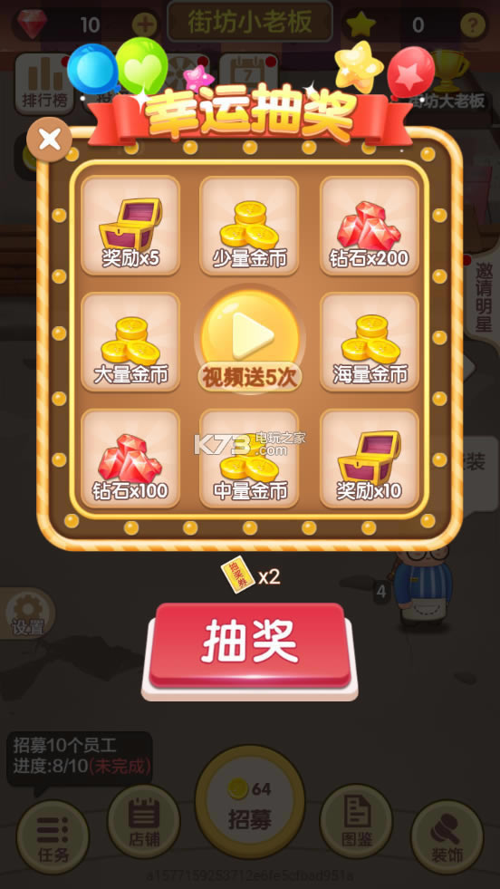 1. 游戏每个店铺可招募合成5个等级的员工,最高等级的为店长,合成三名店长后可解锁新的店铺,解锁后还需要用钻石购买新店铺;