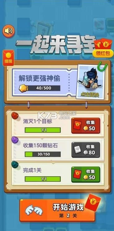 《一起来寻宝红包版》是一款可以领红包的寻宝游戏了,你能够来关卡里面进行神偷的模拟扮演,能够扮演小偷成功的进行偷盗,需要躲避警察,在游戏过程中能够获取红包提现哦。