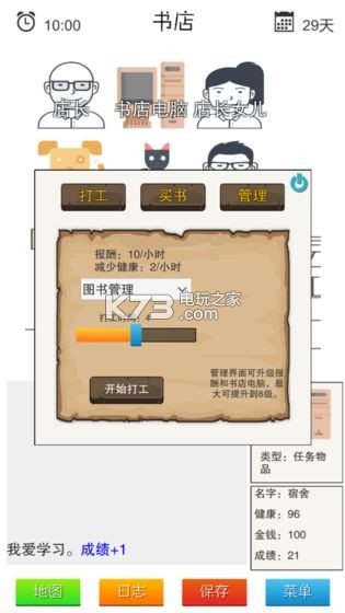 简单指令是一款画面清新、玩法简单的文字模拟游戏。在这款游戏里你需要在30天内用各种方法赚钱,同时也要注意学业和身体。