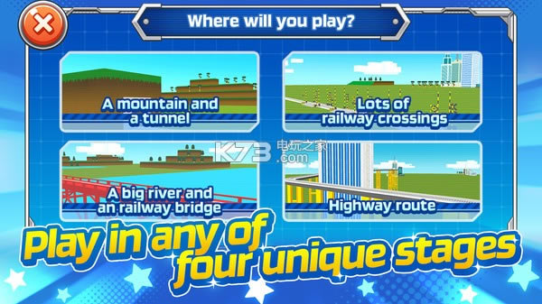 *您可以从火车经过的四个不同阶段中进行选择:“一座山和一条隧道”,“许多铁路道口”,“一条大河和一条铁路桥”以及“高速公路路线”。